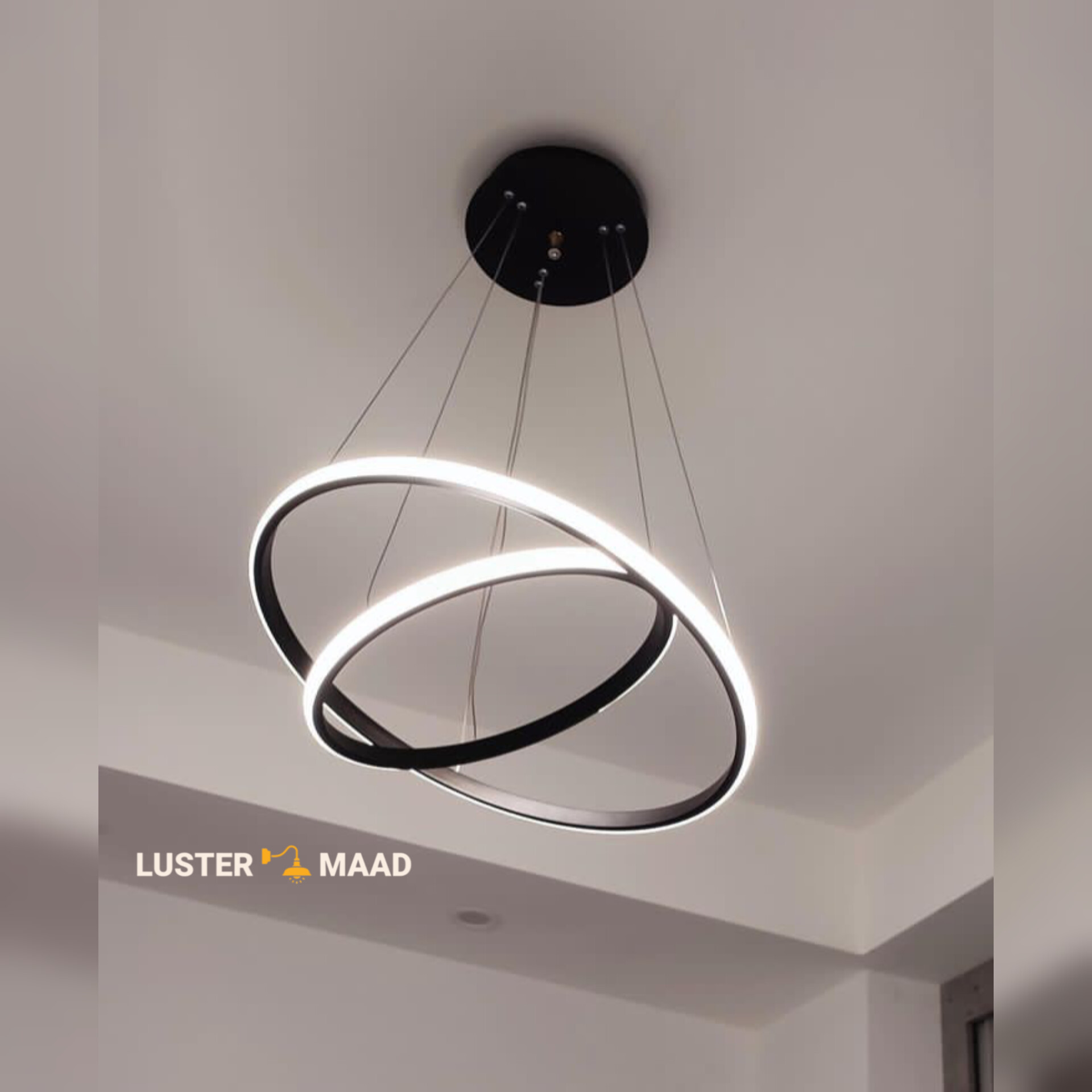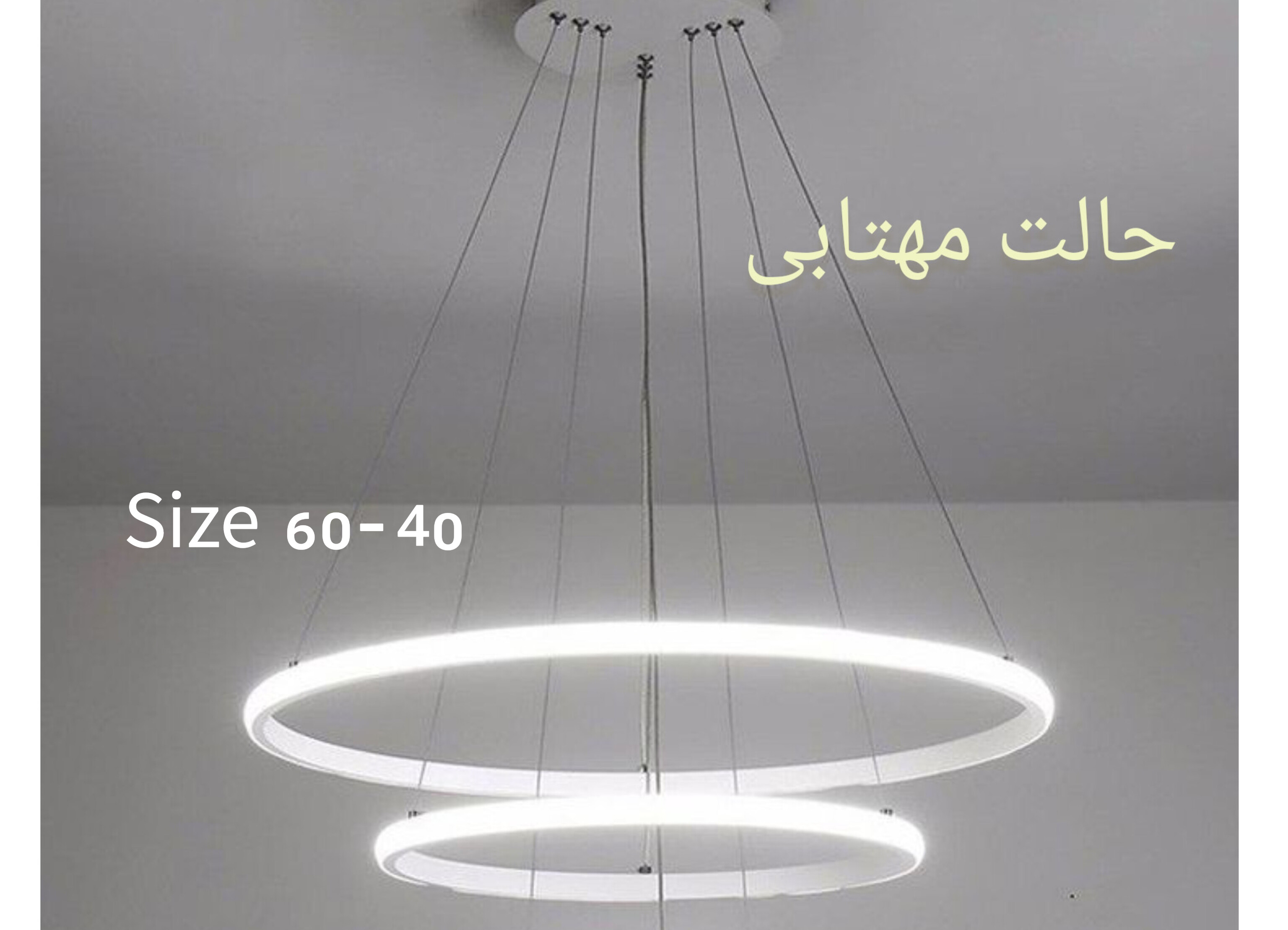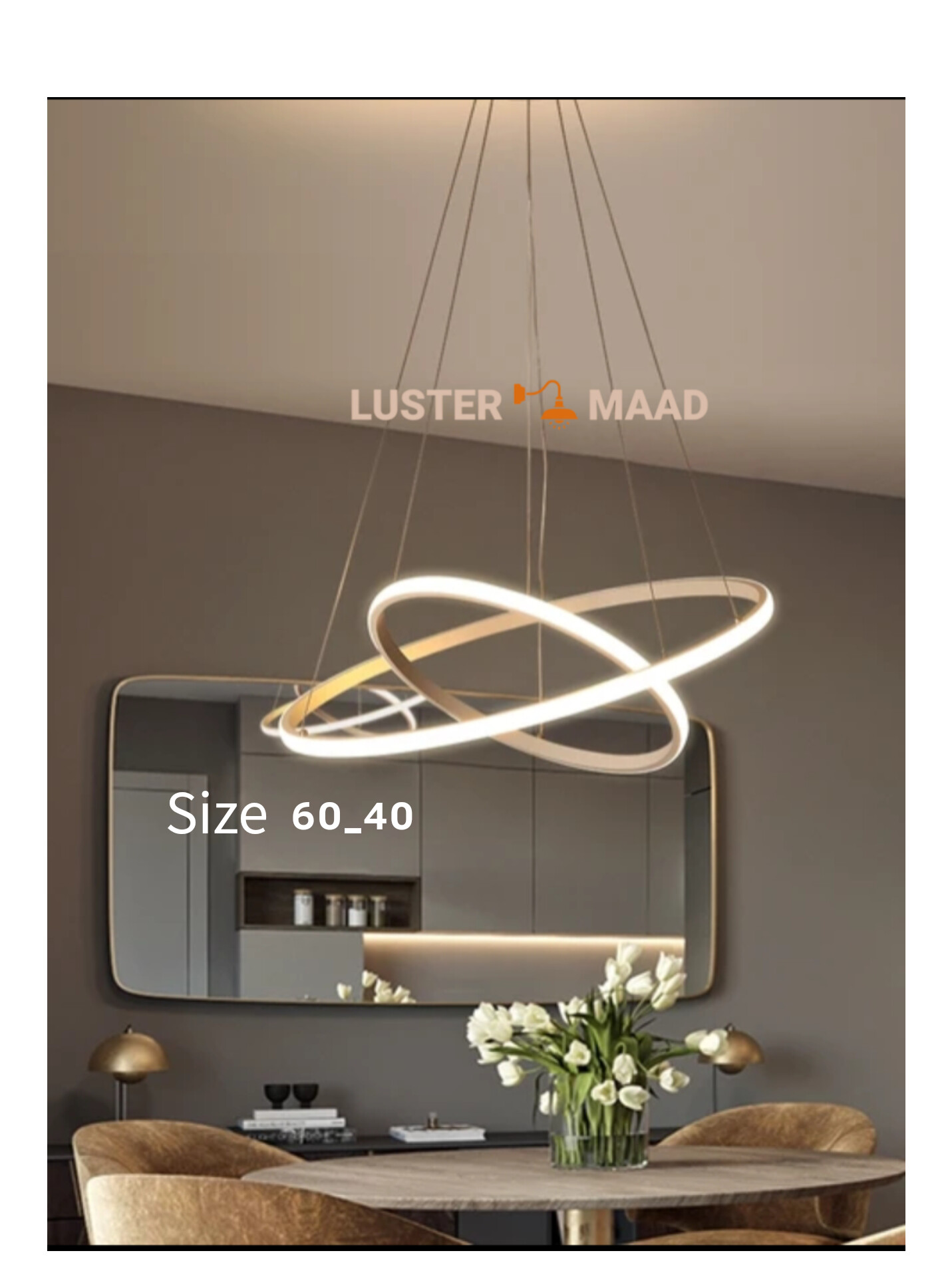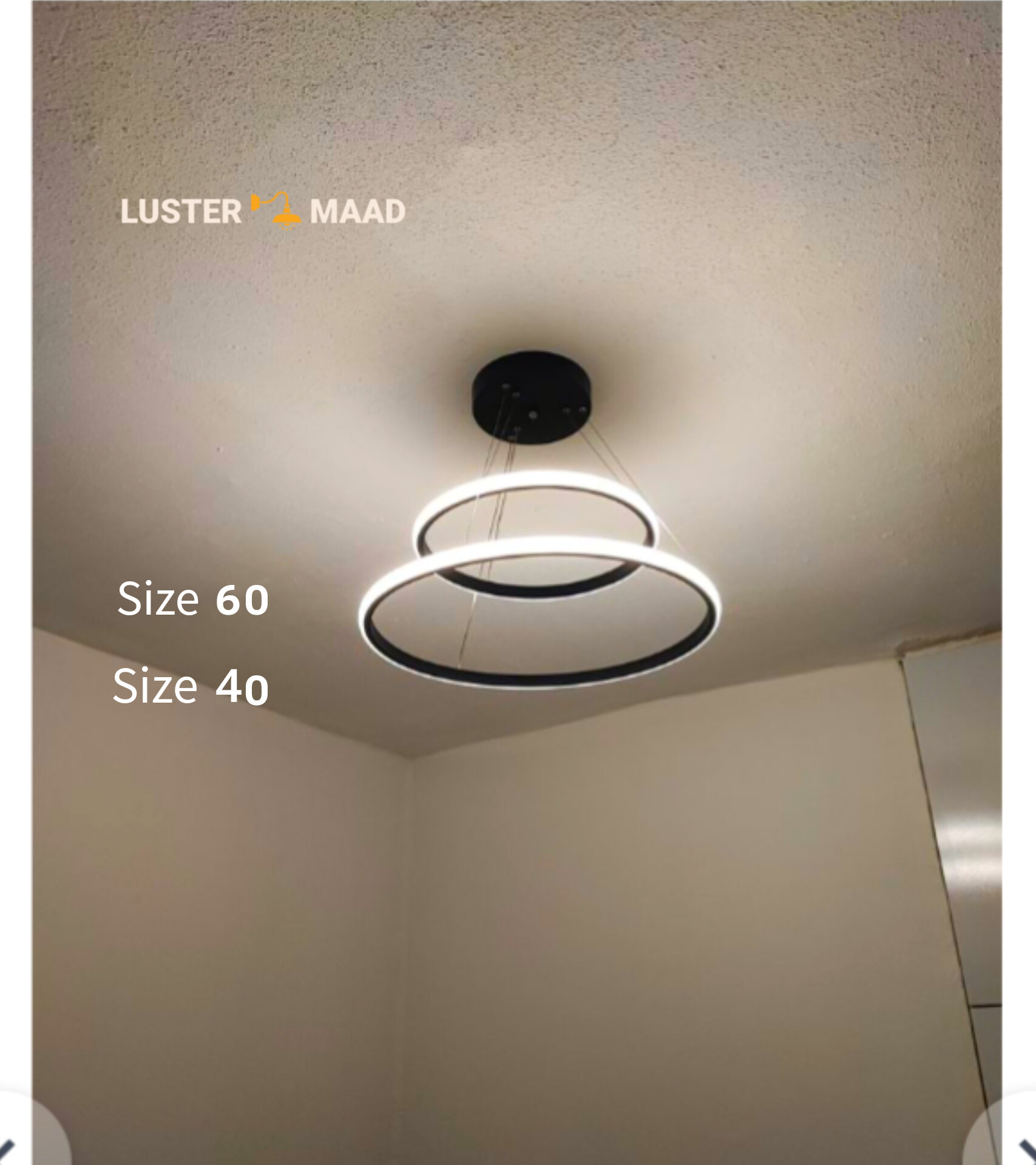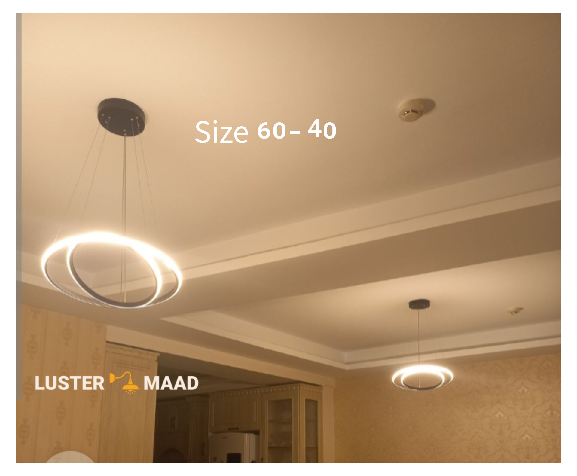 اندازه طبقه اول60طبقه دوم 40این نوع لوسترها توی بازار معروف به لوستر های SMD می باشد و به صورت دو دایره در هم می باشند . که شرکت لوسترماد این مدل لوستر را با کد GR201mتولید ودر سه مدل ۱_تک رنگ(آفتابی یا مهتابی) ۲_سه رنگ بدونه کنترل(تغییر حالت با کلید) ۳_سه رنگ با کنترل+اپلیکیشن موبایل به انتخاب مشتری به فروش می رساند . همچنین میتوانید با کم و زیاد کردن ارتفاع حلقه ها بیشترین ارتفاع آن60 سانتی متر و کمترین ارتفاع آن 25 سانتی متر می باشد. این نوع لوستر های ساخته شده از روی نمونه مشابه خارجی می باشد ولی با متریال با کیفیت ایرانی و هزینه ی کمتر از نمونه های خارجی. لوسترماد مفتخر است که لوسترهای تولیدی رابا بالا ترین سطح کیفیت و متریال موجود در ایراندعرضه میکند .شما میتوانید از نوع لوستر ها در سالن های پذیرایی اتاق خواب آشپزخانه و یا حتی محیط های اداری و کافه ها استفاده نمایید .