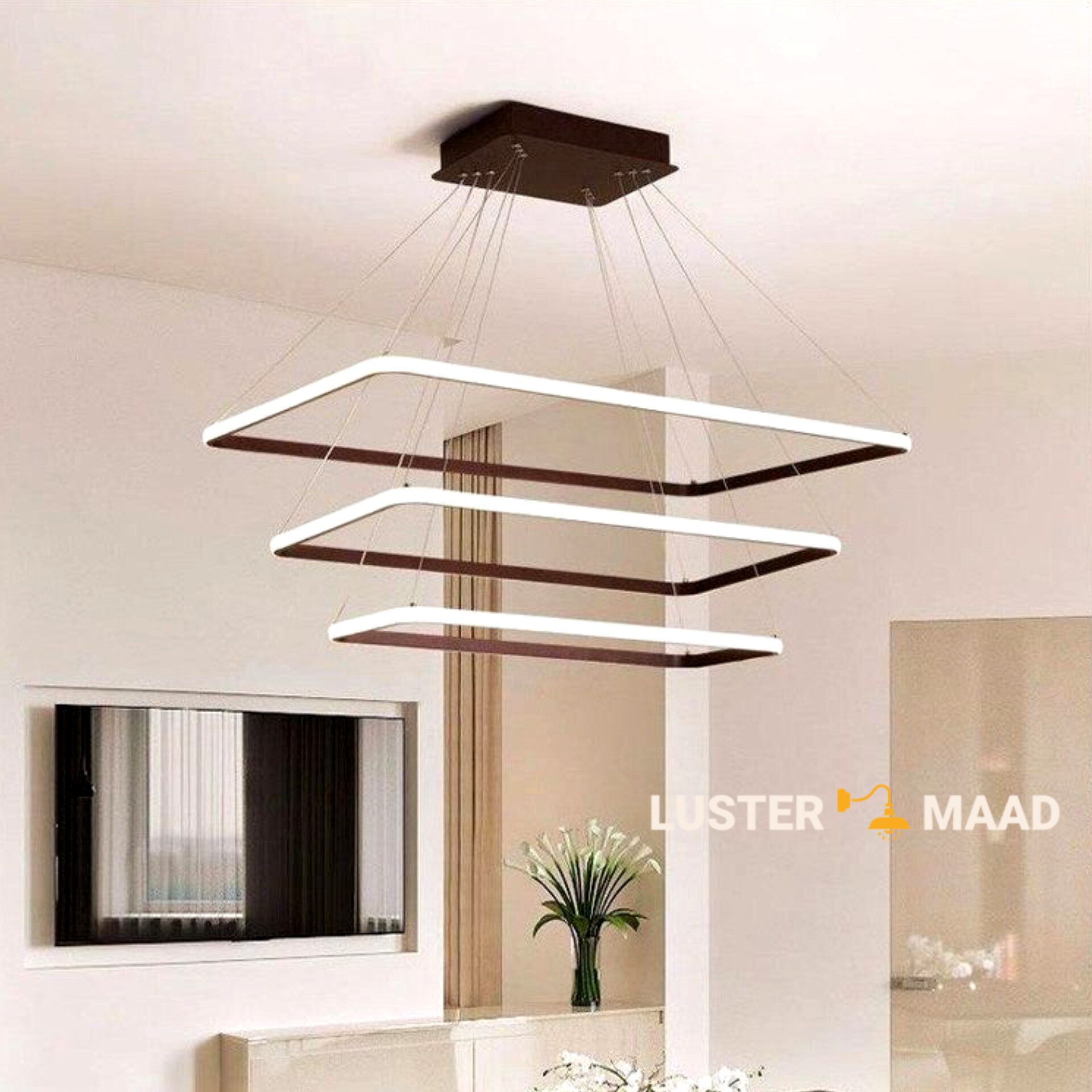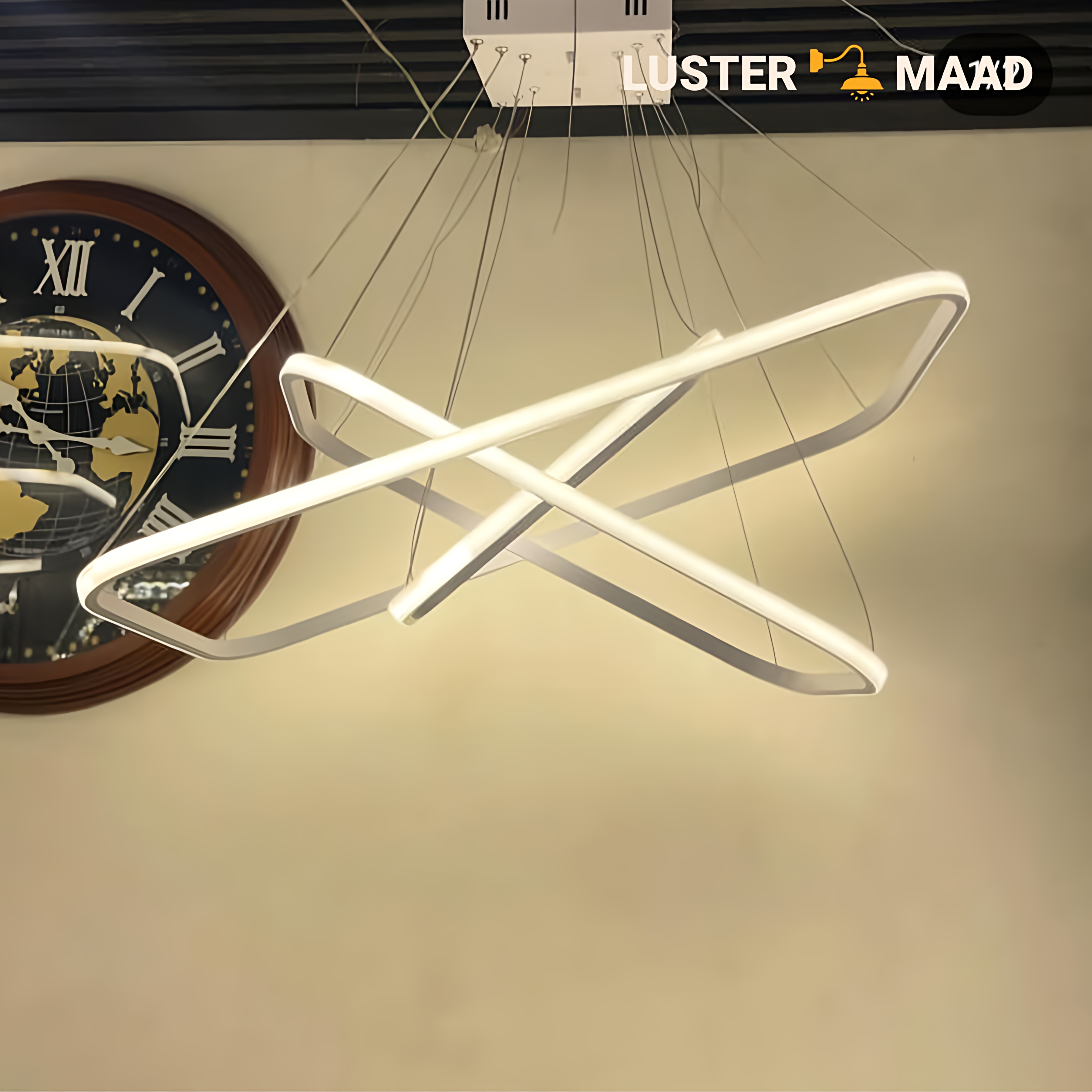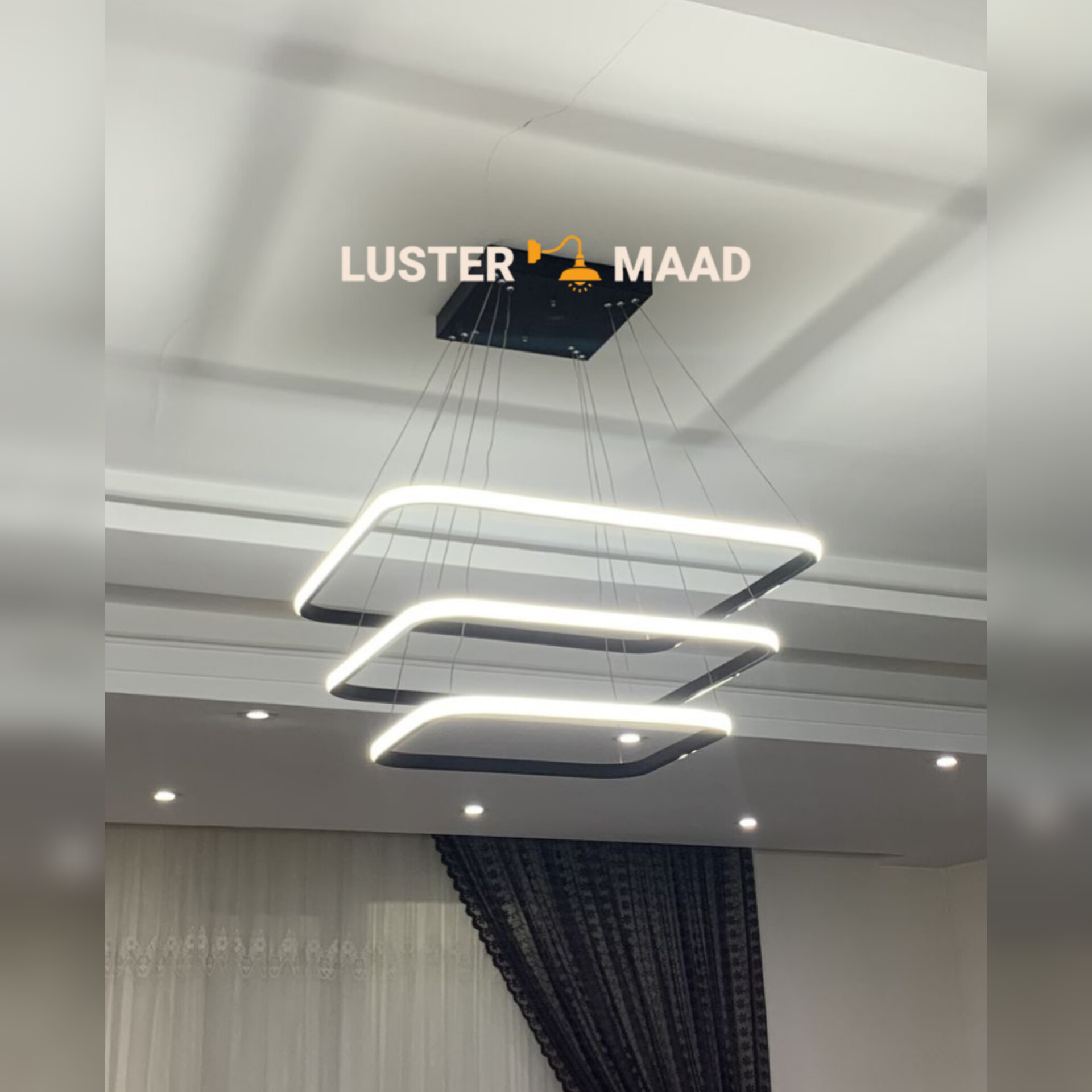 بسیار زیباست خود حلقه های لوستر به صورت مورب نسبت به همدیگه قرار میگیرد فقط چون سیم های که به حلقه ها وصل است خیلی بلند بود از سقف خیلی پایینتر قرار میگیرد و از آنجا که ما قد بلند هستیم برای اینکه به سر برخورد نکند سیمها را کمی کوتاه کردیم که تنظیم کردنش کمی سخت بود ولی در کل لوستر زیبایی است نور آن هم خوب است در کل از سازنده سپاسگزارم